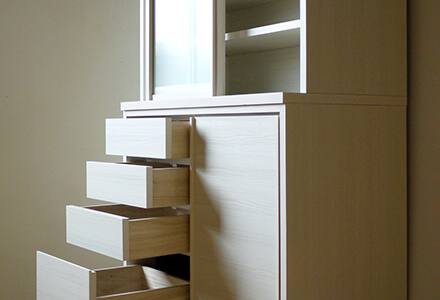 可動棚式の引き戸収納と引き出しを備えた充実の収納力