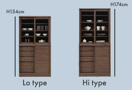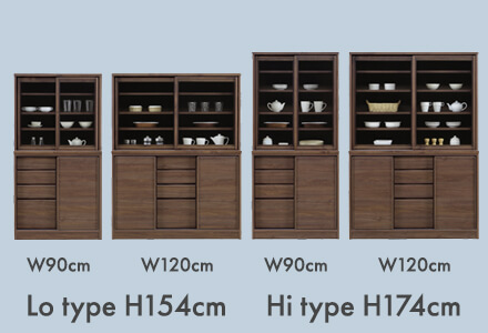 ダイニングボードは、190cm台~2m台が中心のキッチンボードの中でも、ハイタイプでも174cmと低めです。