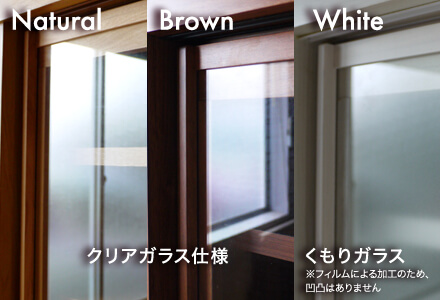 ナチュラルとブラウンはクリアガラス、ホワイトはくもり加工フィルム貼りで本体カラーに応じたガラスカラー