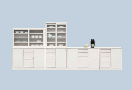 メモワールは、リビングボードとしても十分使える背が低めのサイズのダイニングボードとカウンターの収納シリーズです。